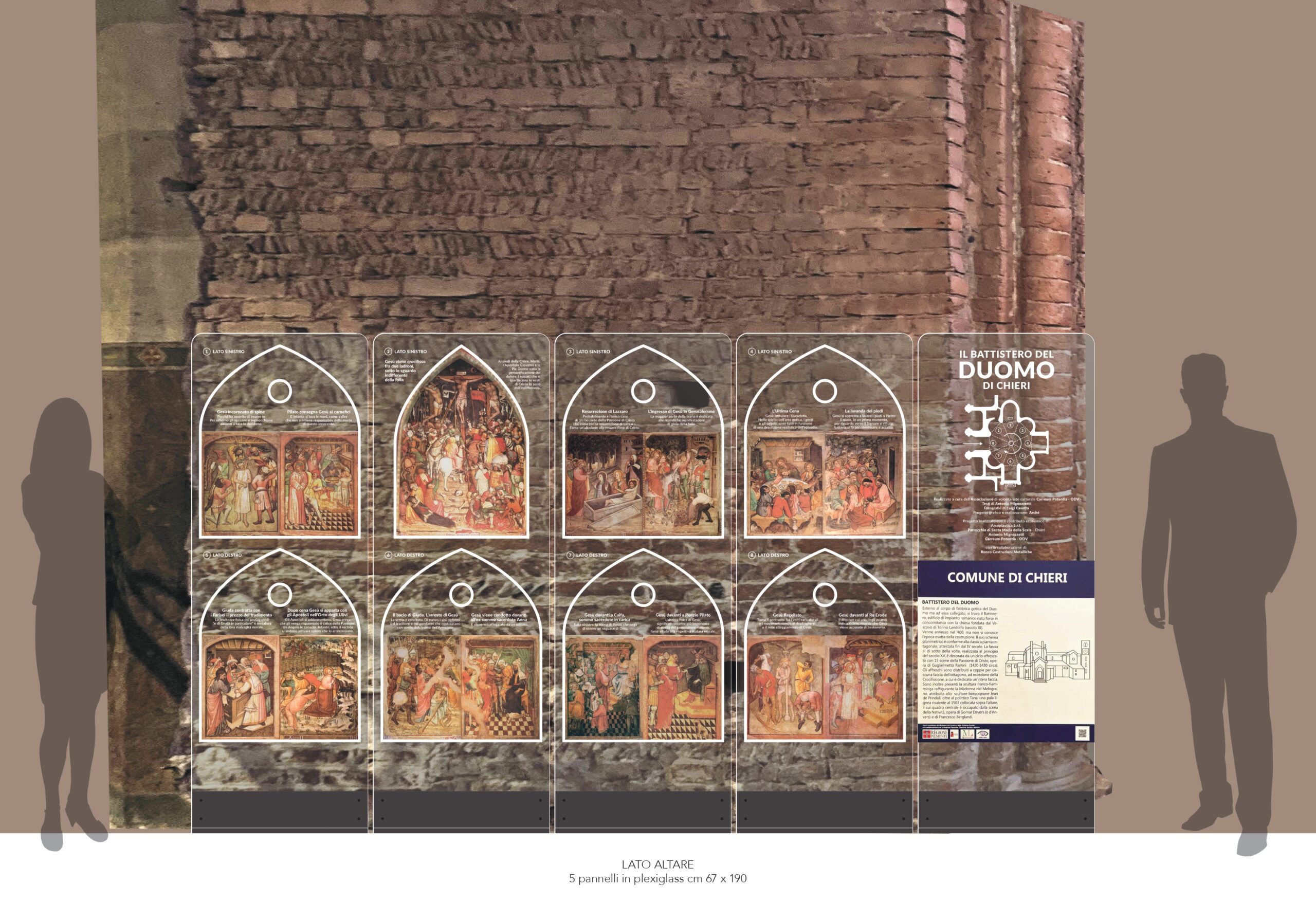 L’espositore, realizzato allo scopo di facilitare la lettura delle immagini, riporta la sequenza dei dipinti secondo una logica di percorso in senso orario lungo l’ottagono. Cioè, un procedere da sinistra verso destra per terminare al punto di partenza: l’ingresso. Sui pannelli le immagini seguono questo percorso ma essendo 4 e non 8 come sono le nicchie del tamburo, i dipinti (a coppie come si presentano) sono riprodotti dal primo al 4° nella parte alta del supporto e dal 5° all’8° nella parte bassa. Da notare che gli affreschi si presentano in una sequenza che non rispetta l’andamento cronologico degli avvenimenti della Passione, così come la si conosce tradizionalmente. A puro titolo d’esempio: mancano la salita al Calvario, la discesa dalla croce e manca la resurrezione di Cristo, immagine simbolica della rinascita a nuova vita; esattamente ciò che rappresenta l’atto del battesimo. Così, anche l’espositore, o totem se si preferisce, rispetta fedelmente la posizione sequenziale degli affreschi e non invece la Passione secondo la liturgia.