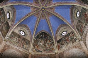 Nell’immagine gli affreschi di Guglielmetto Fantini rappresentanti la Passione di Cristo sul tamburo del Battistero