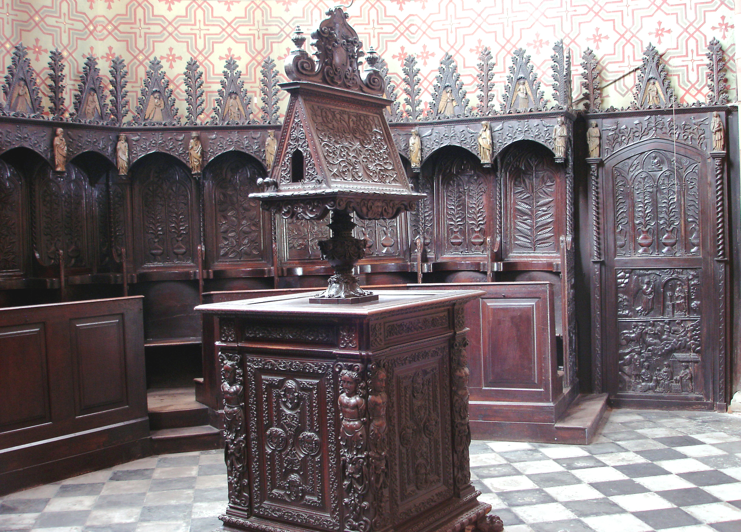 In occasione dei restauri generali della chiesa (1874-1880), il responsabile dei lavori conte Edoardo Arborio Mella, contro il parere di altri intenditori (fra i quali il pittore chierese, ma anche esperto di arredo antico, Alberto Maso Gilli, che era stato incaricato di seguire l’operazione), volle spostare il coro nell’abside (n. 2 nella planimetria). Una decisione che non ha certo giovato al capolavoro scultoreo. Quel trasferimento, infatti, oltre ad aver comportato il sacrificio di alcuni dossali, non si può dire che abbia giovato alla visibilità di un tale capolavoro.